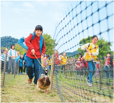 在重庆市北碚区歇马街道虎头村,青少年们参加春假主题实践活动,进行赶鸭子比赛。 秦廷富摄(人民图片)