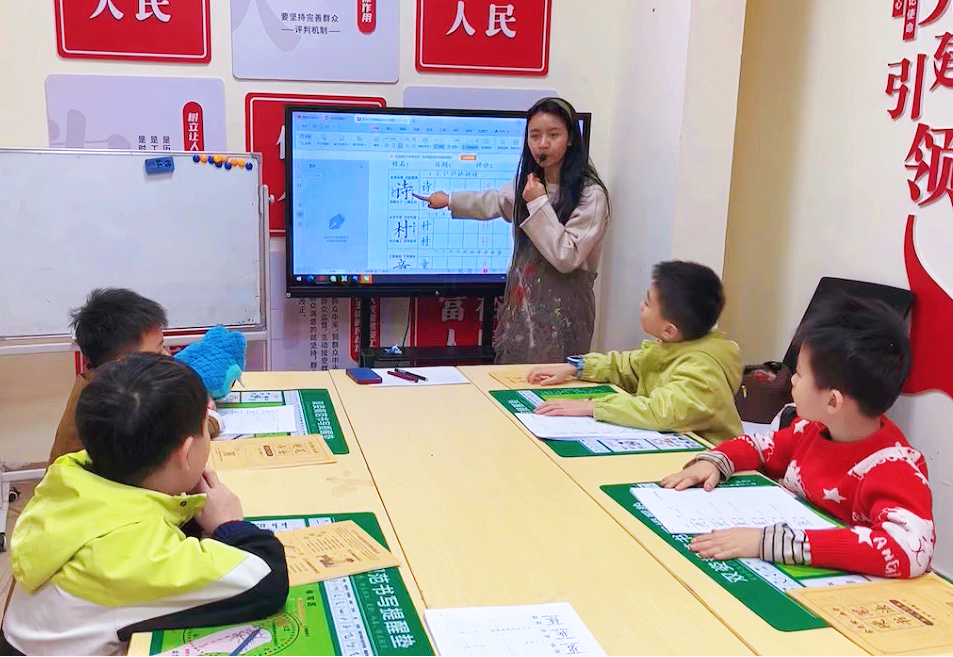 江城区漠阳湖社区公益课堂专业教师为学生讲授硬笔书法课程。阳江市委组织部 供图