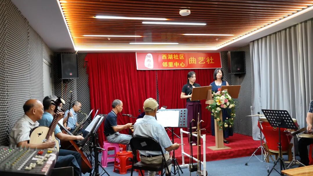 阳西县西湖社区邻里中心一角——社区曲艺爱好者在曲艺社进行排练。阳江市委组织部 供图